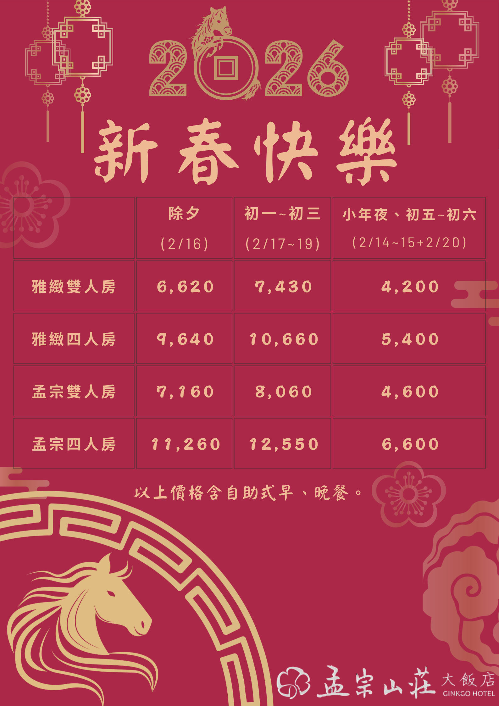 新年將至,帶著家人來溪頭森林,享受難得的山林慢活吧!入住孟宗山莊大飯店,一泊二食專案,白天隨興漫遊溪頭、杉林溪,感受山林清新的氣息;晚上盡情享用自助餐,品味在地美味佳餚,吃好住好輕鬆過好年。